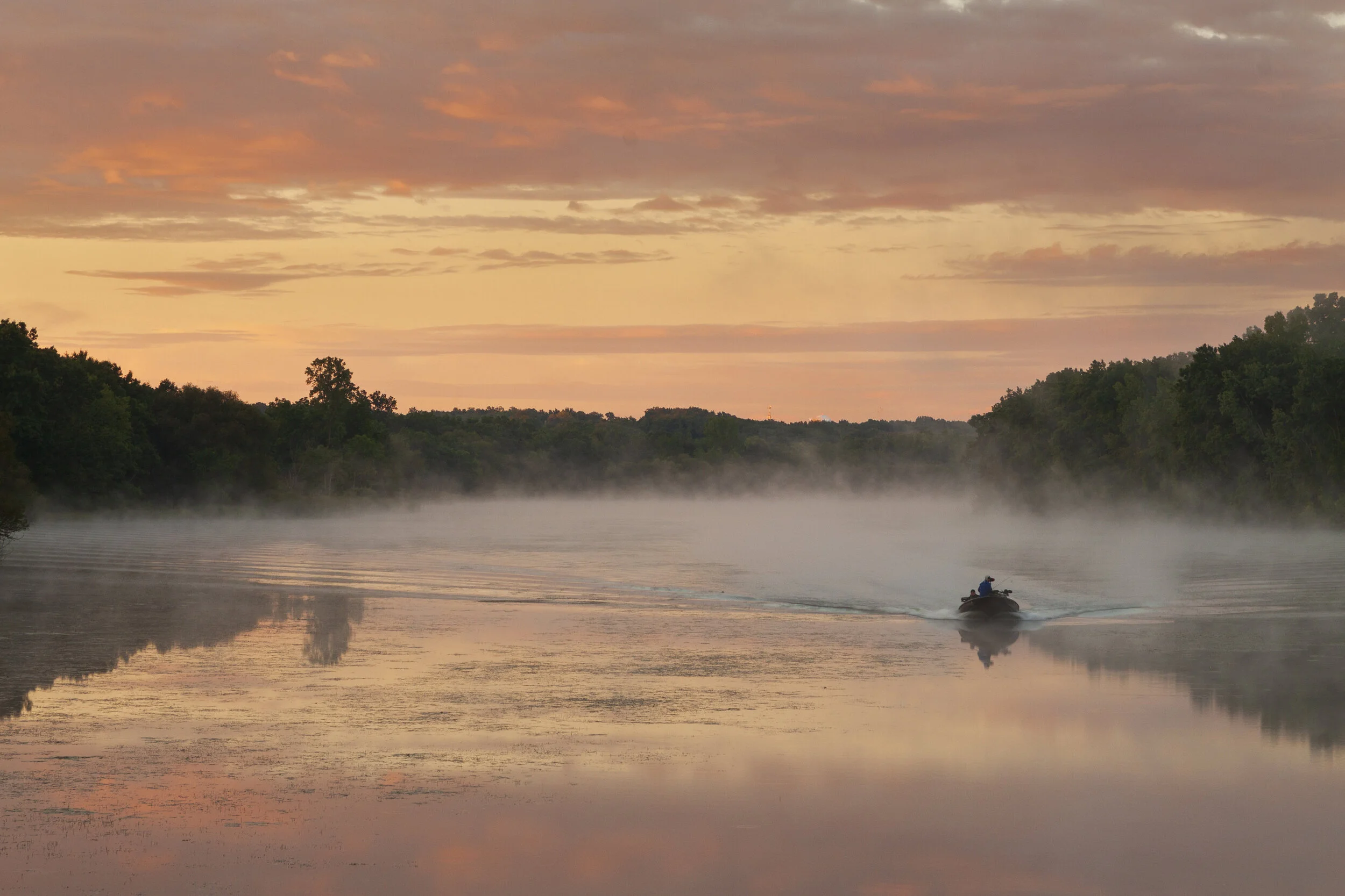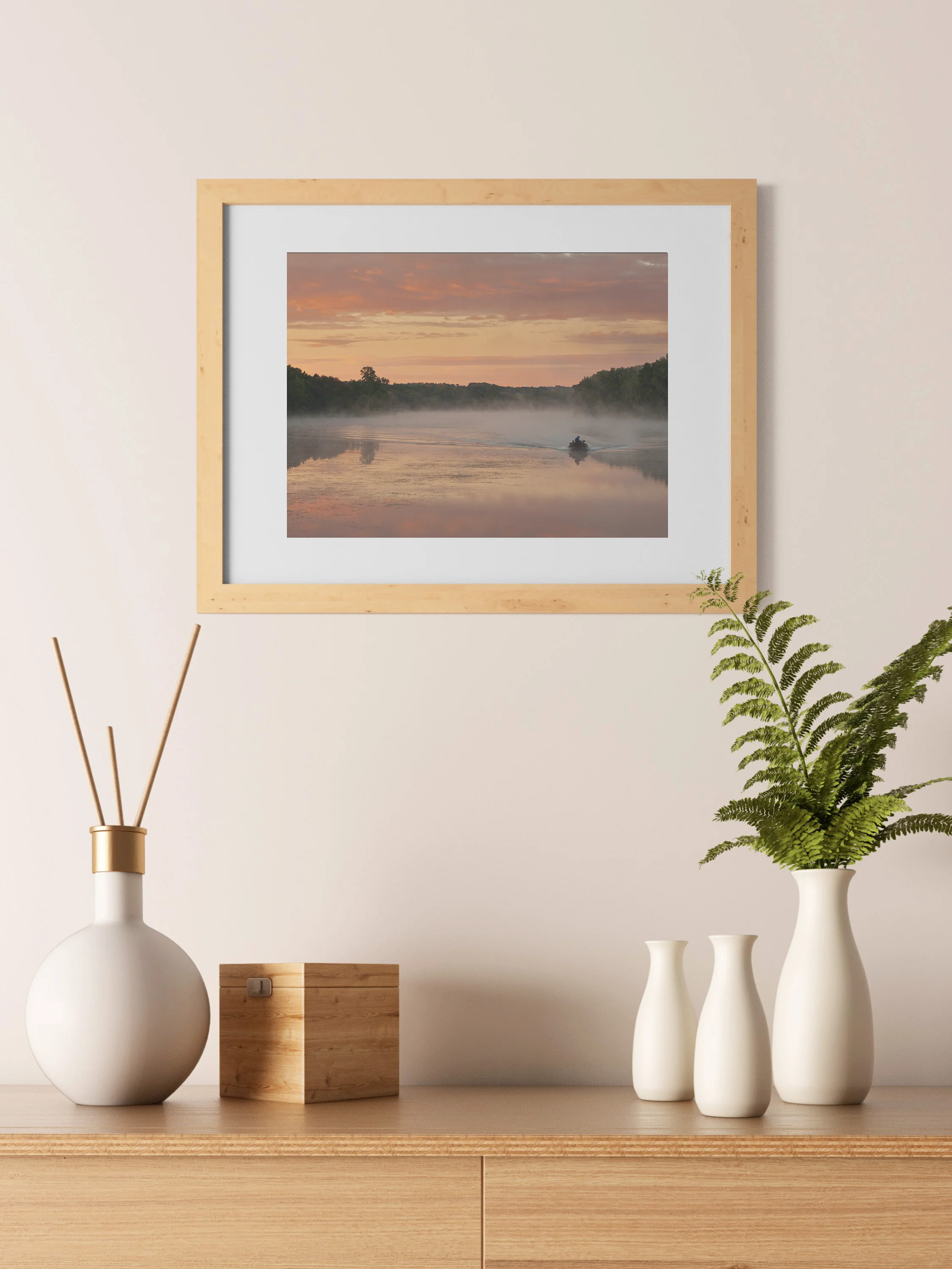 Pink, purple and golden clouds are lit by the sunrise over a tree lined mist covered lake. A small fishing boat carves the still water as it moves out of the fog and into the scene.