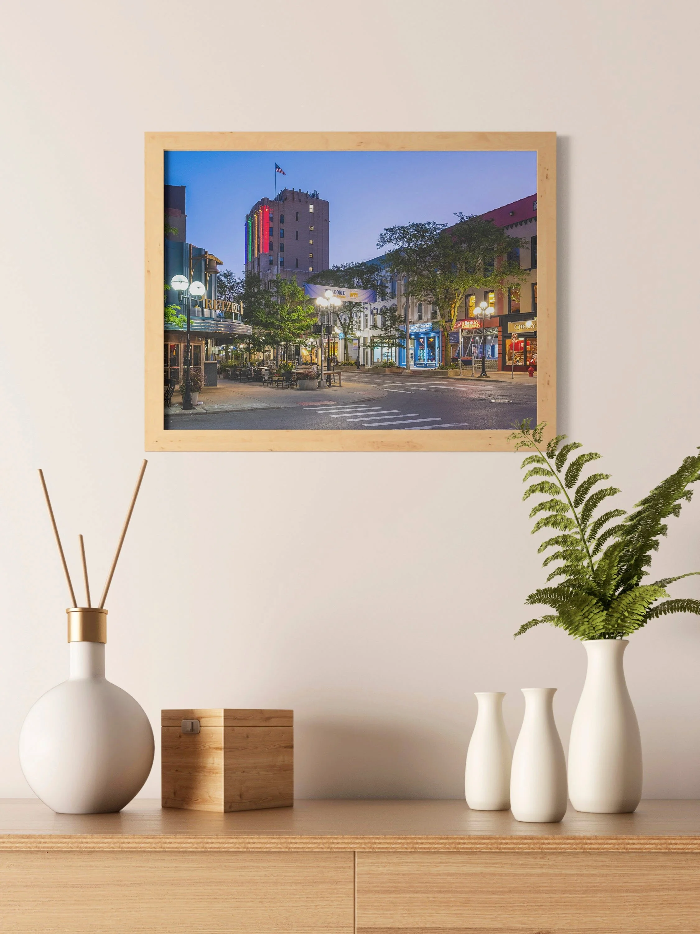 I love getting out early to photograph in Ann Arbor. The 'blue hour' is my favorite time to shoot city scapes as there are fewer people and cars moving about, and the pre-dawn light enables me to emphasize the color and texture of the architecture and neon lights. This image features a view of Main Street looking south from Liberty Street toward the the First National Bank building, the large building in the background. The Pretzel Bell restaurant as well as other downtown shops are visible in the image as well. Located near University of Michigan campus, this area of town is home to many local favorite shops and restaurants.