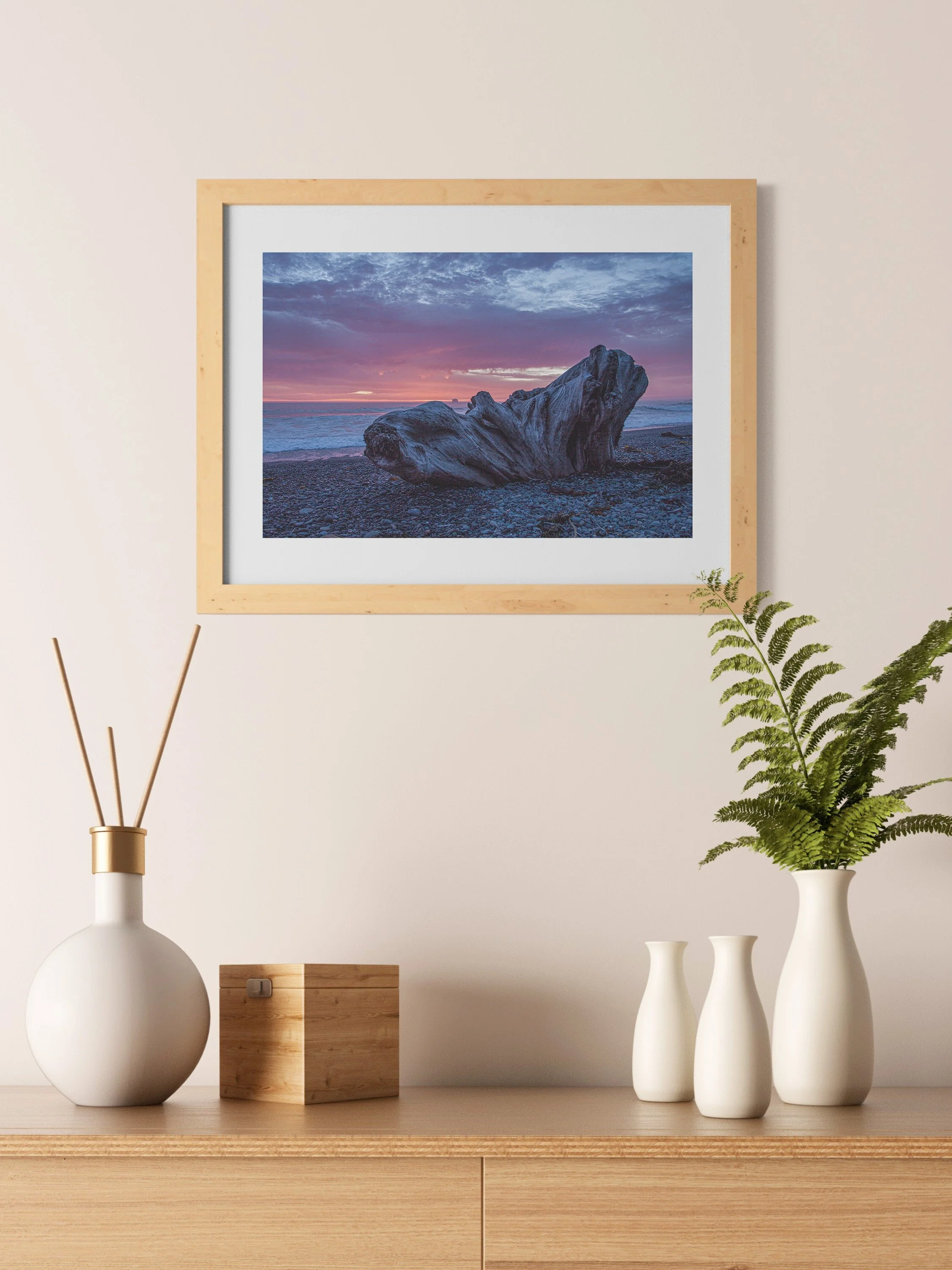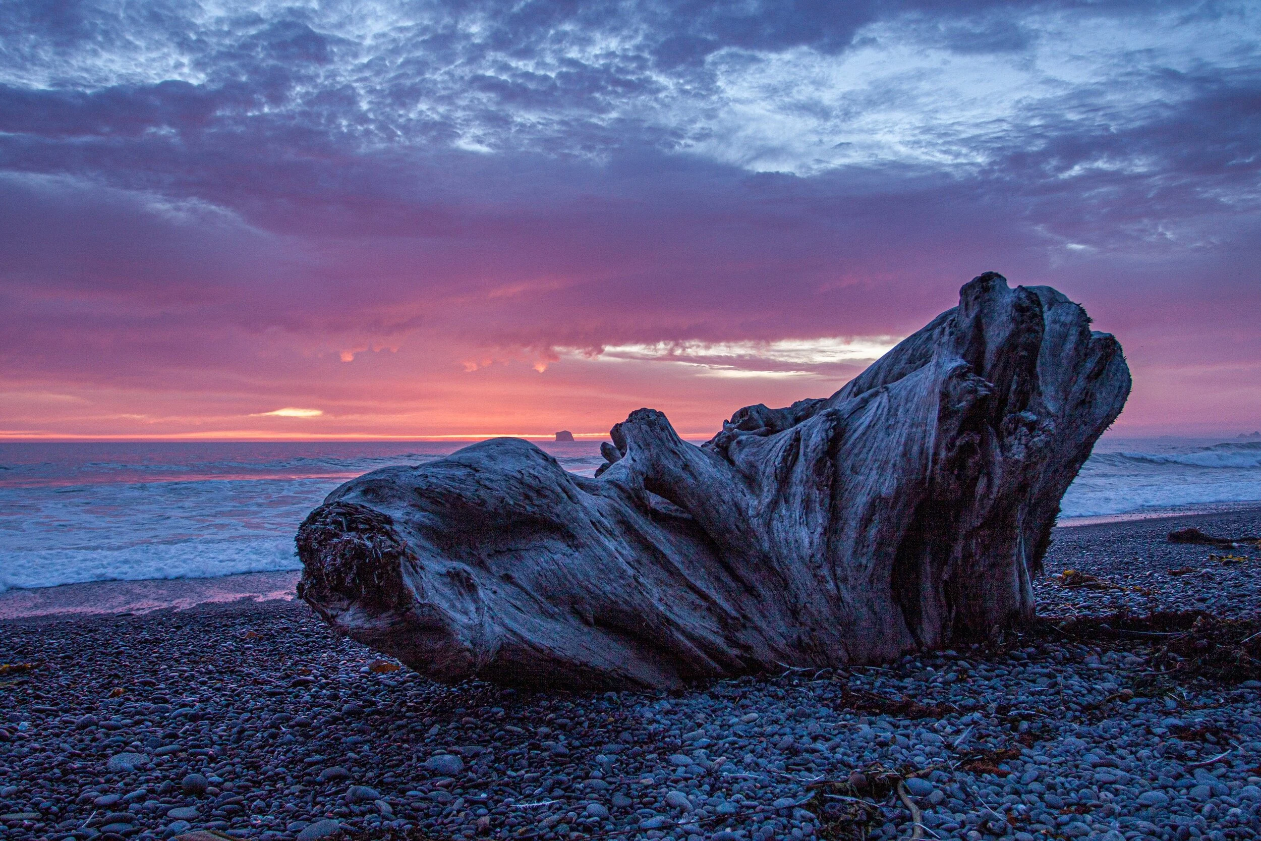 Pink, mauve, blue and magenta hues color a large driftwood stump at sunset over the Pacific Ocean. Taken at Rialto Beach in Olympic National Park.