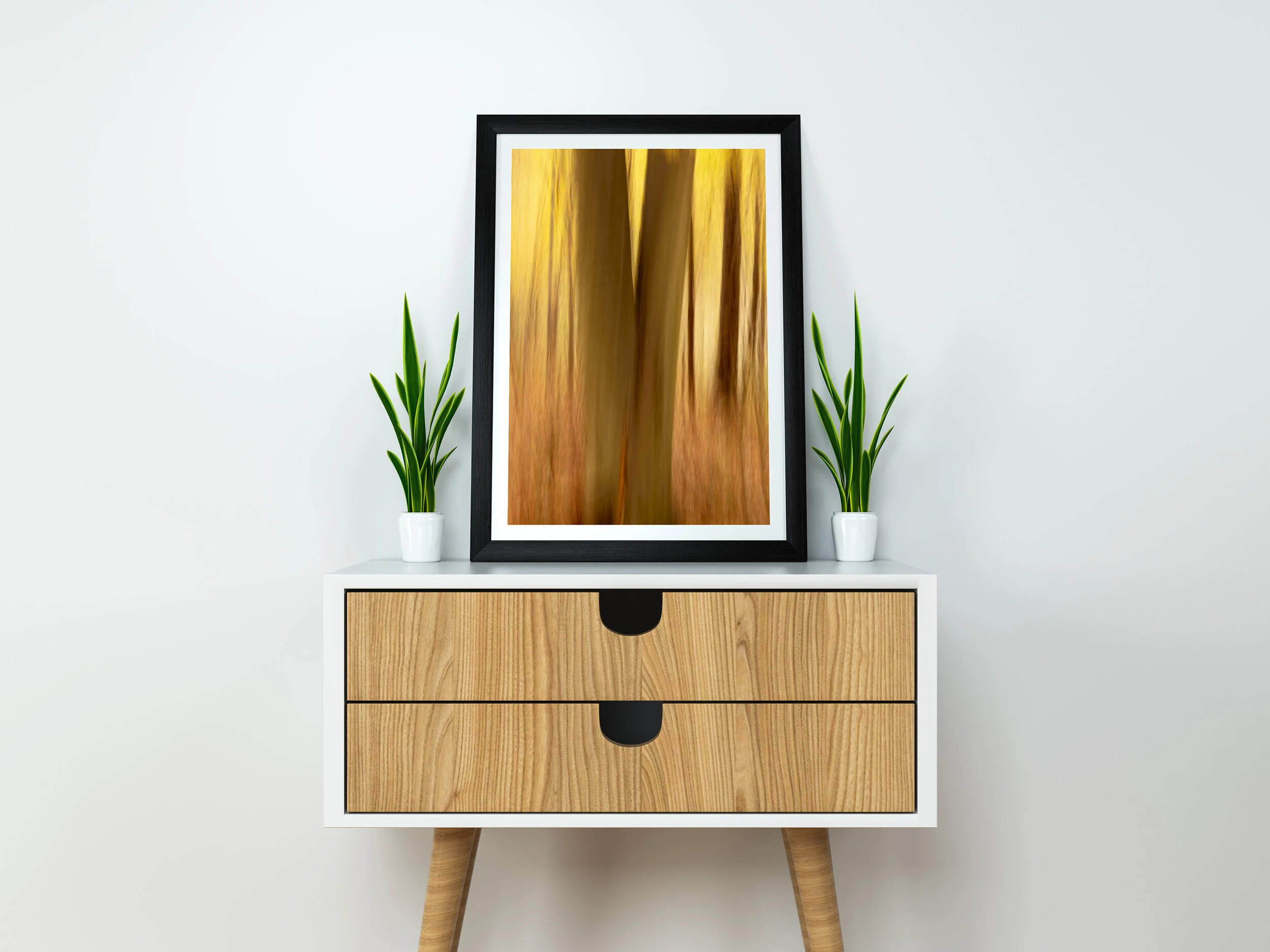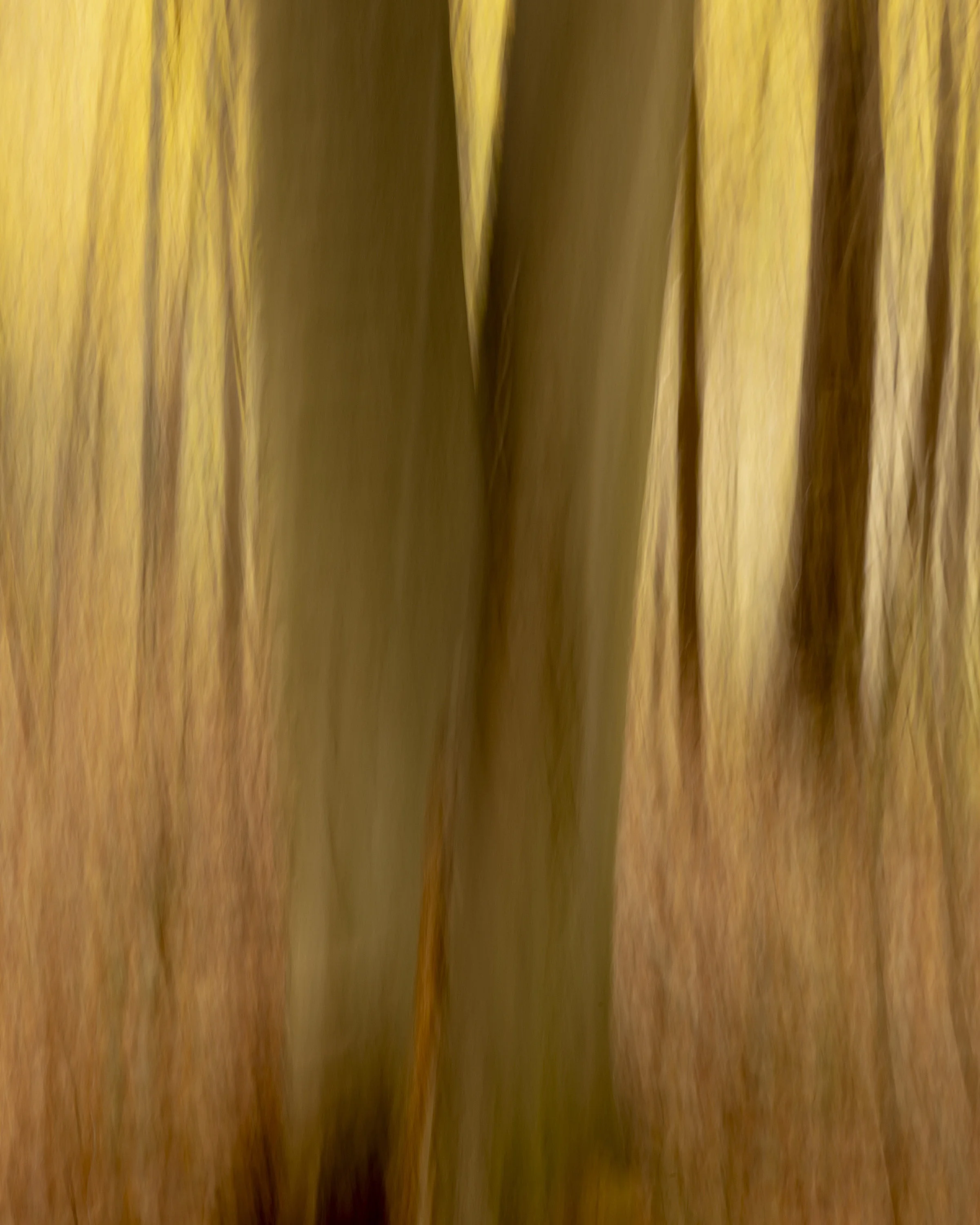 Abstract photograph of a small woodland in the autumn. The image attempts to isolate the shape and form of the tree trunks and branches using ICM or Intentional Camera Movement. With the aperture open, a slight camera movement is used to change the look and texture of the scene, while retaining the natural shapes and identity.
